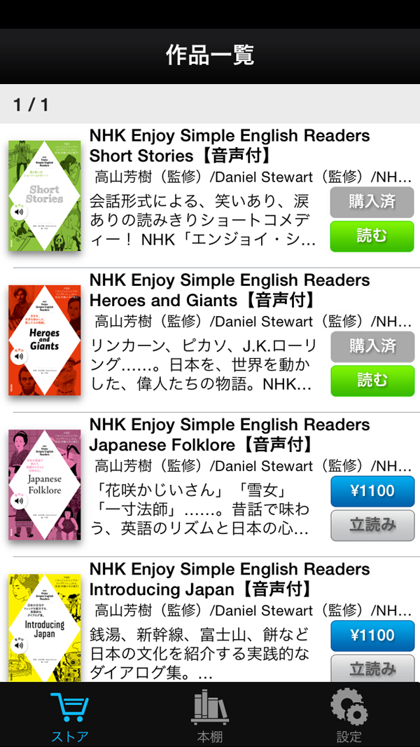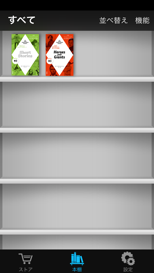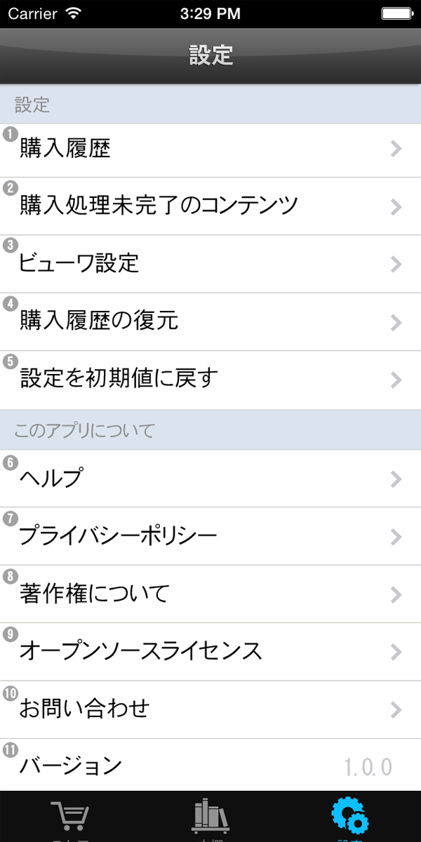 1. 購入履歴:以前に購入した電子書籍をリスト表示します。電子書籍がデバイス内ダウンロードされているときは、「ダウンロード済み」と表示されます。デバイス内に購入した電子書籍が無いときは「再ダウンロード」ボタンが表示されます。これをタップすると無料で再ダウンロードできます。またここで、デバイスにダウンロードした電子書籍の削除を行うこともできます。