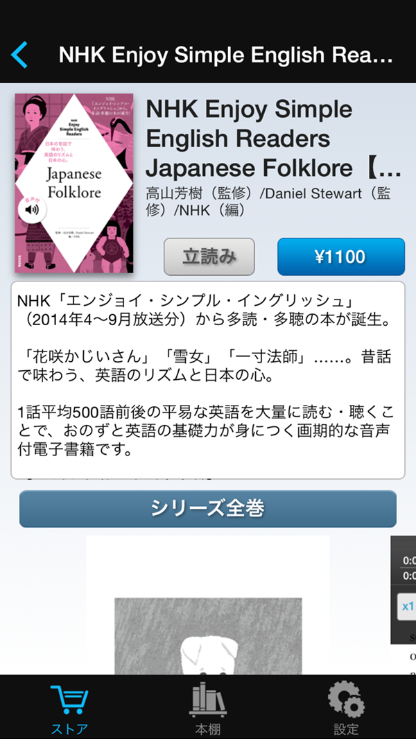 「ストア」画面や「本棚」画面の下部にある「設定」では、「語学リーダー」で購入した電子書籍の復元などの操作ができます。