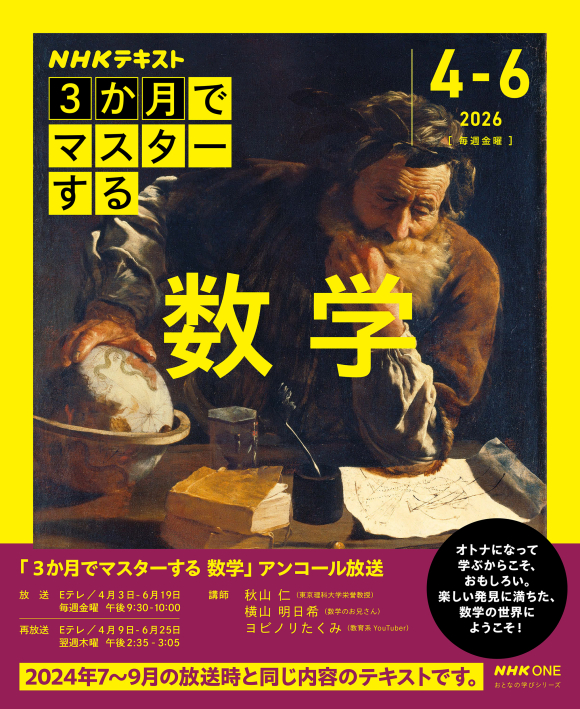 円周角の性質、三平方の定理、確率、図形、倍数・約数、関数など、中学・高校数学でつまずく人が多いテーマをわかりやすく解説します。日常で役立つ数学的思考法も紹介。たとえば、「三平方の定理」の回では、「GPSの位置測定や、地平線までの距離を測る」といった日常での使われ方や、定理が生まれた歴史的背景、証明方法の解説、そしてチャレンジ問題なども掲載。