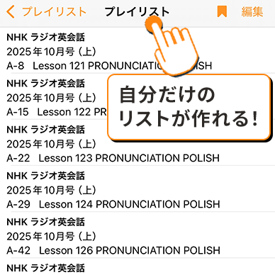 繰り返し聞きたいトラックを集めて自分専用のプレイリストにすることで、苦手な部分を集中的に強化したり、なめらかに話す練習をすることができます。
