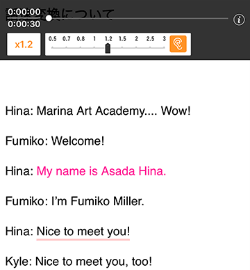 語学プレーヤーでは、スキットや単語コーナーの文字情報を画面に表示することができます。