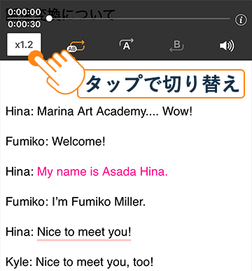 話速変更後に耳アイコン耳ボタン」を使うと、再生速度を速めても、より自然な早口になり、クリアな音声で学習することができます。