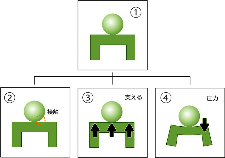 前置詞類のイメージは単純な位置関係です。onは、みなさんがよくご存知の通り「~の上」。「~の上」という日本語訳ではなく「~の上」という位置関係であることに注意してください。「~の上」という位置関係(①)はすぐさまon Sundayを生み出します。「日曜日」という(面積をもった)ステージ状の場所が意識されているのです。また「~の上」は「接触②」につながります。On A, B(Aが起こるととすぐB)といった使い方はこの延長線上にあります。また「~の上」を「(下が上を)支えている(③)」と解釈すればdepend on(~に依存する)もすぐに納得できるでしょう。さらに「(上が下を)圧迫している(④)」と取れば、concentrate on(~に集中する)、influence on(~に対する影響)といった使い方も自然です。力が対象に向かうことを意味しているからです。look down onも自然な使い方ですよ。